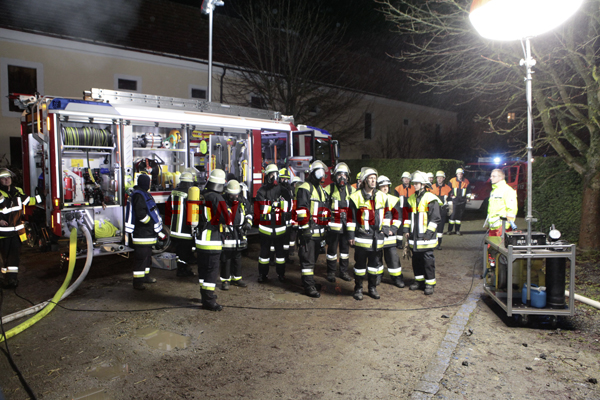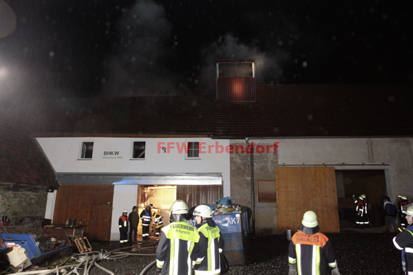 Dort angekommen übernahm die FFW Erbendorf den Erstangriff unter schwerem Atemschutz und drang in das brennende Gebäude vor. Die Gefahrenlage war schwierig abzuschätzen, aber sowohl Dieseltanks als auch der Betriebsraum des BHKW mit den Maschinen sowie Heißwasserrohre galt es zu schützen.
