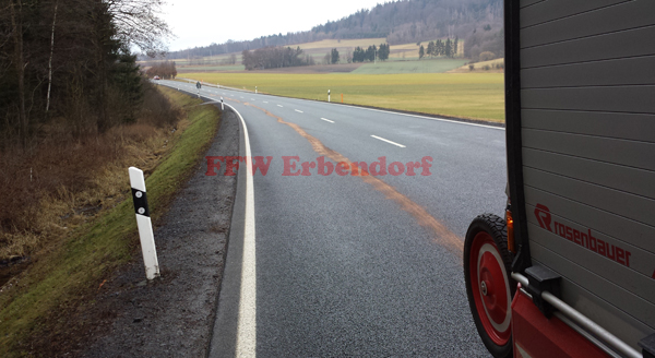 Zuvor waren bereits die Feuerwehren aus Waldeck und Guttenberg im Einsatz, die im dortigen Straßenabschnitt das sich auf der Fahrbahn befindliche Mineralöl bindeten. Da sich die Spur über mehrere Kilometer bin nach Erbendorf (Höhe Straßenschacht) hinzog, wurde die FFW Erbendorf unterstützend hinzu gerufen. Von der Abzweigung nach Tiefenbach bis nach Erbendorf wurde das Mineralöl gut 2 km lang und 20 cm breit auf der Fahrbahn gebunden, um die Rutschgefahr für Fahrzeuge und Motorräder zu minimieren.