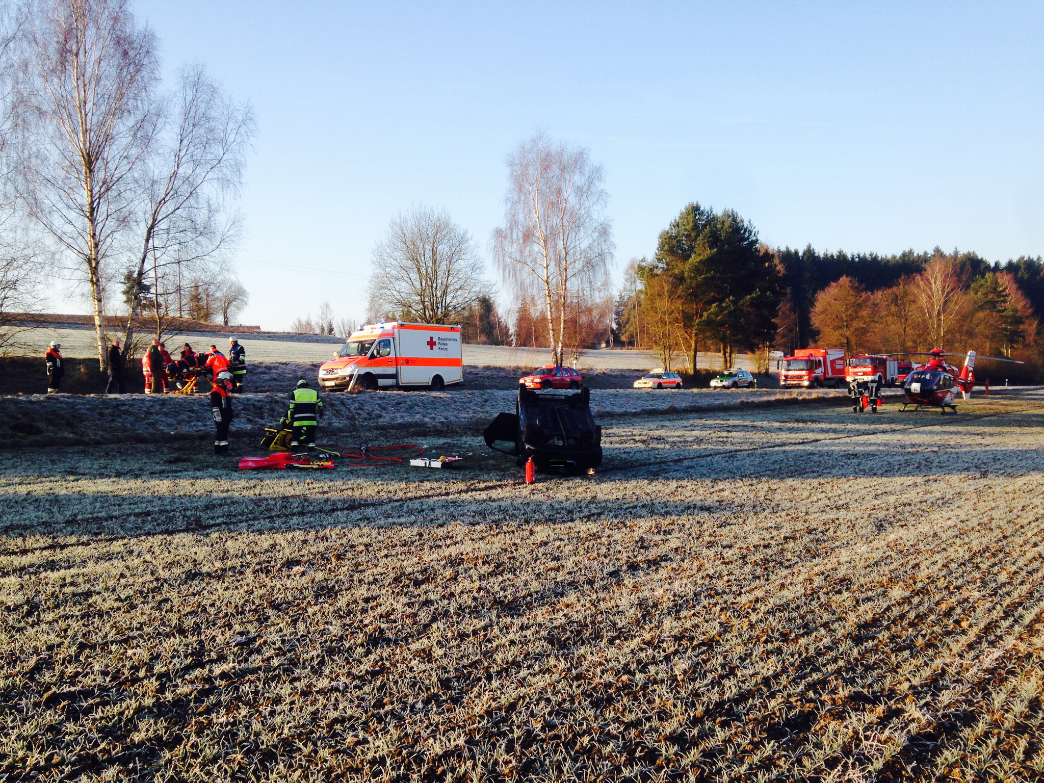 Im angrenzenden Acker überschlug sich das Fahrzeug. Der Fahrer konnte von der Feuerwehr glücklicherweise ohne technisches Gerät aus seinem Fahrzeug befreit werden. Er erlitt bei dem Unfall leichte Verletzungen. Vorsorglich wurde er mit einem Rettungswagen in ein Krankenhaus eingeliefert. Der angeforderte Rettungshubschrauber wurde nach Auskunft der Polizei nicht benötigt. Am Fahrzeug entstand ein wirtschaftlicher Totalschaden von rund 3.000 Euro. Die Feuerwehr Krummennaab übernahmen die Absicherung der Unfallstelle und die Umleitung der Verkehrs. Die B299 wurde im Bereich der Unfallstelle halbseitig gesperrt.