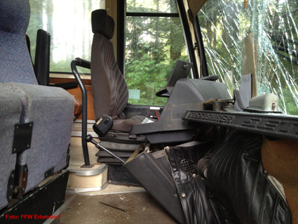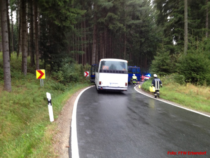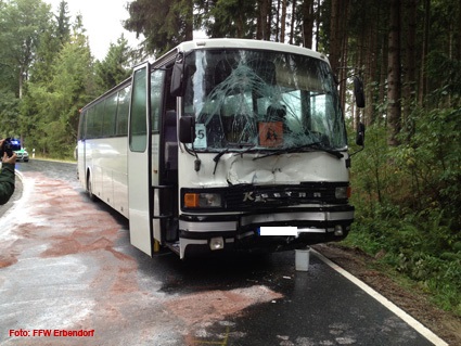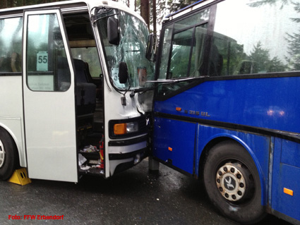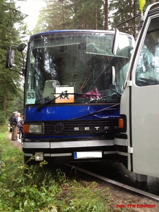 Zu einem Zusammenstoß zwischen zwei Schulbussen kam es am Dienstagmorgen auf der B299 zwischen Erbendorf und Hessenreuth. Beide Schulbusse waren zur Beförderung amerikanischer Schüler aus Erbendorf in die Elementary School nach Netzaberg eingesetzt. Den ersten Ermittlungen der Polizei zufolge war ein unbesetzter Bus in Richtung Erbendorf unterwegs. In dem Waldstück zwischen Hessenreuth und Erbendorf kam dieser Bus dann auf der engen und kurvigen Straße aus bisher unbekannter Ursache in einer Rechtskurve nach links auf die Gegenfahrbahn. Dort kollidierte er dann mit einem entgegenkommenden Schulbus der mit 23 Kindern besetzt war.