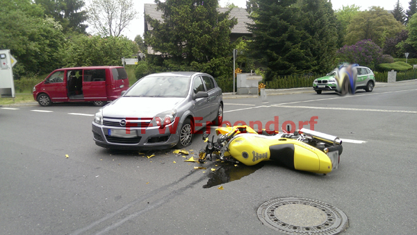 Auf dem Weg durch Erbendorf in Richtung Marktredwitz wurde am Pfingstmontagmorgen einer 30jährigen Motorradfahrerin ein Fehler eines PKW-Fahrers zum Verhängnis. An der Kreuzung Marktredwitzer Straße/ Thanner Straße übersah ein 48-Jähriger die Bikerin und fuhr mit seinem PKW auf die Hauptstraße ein. Die Motorradfahrerin konnte zwar noch bremsen, rutschte aber dennoch gegen den PKW und verletzte sich dabei erheblich.