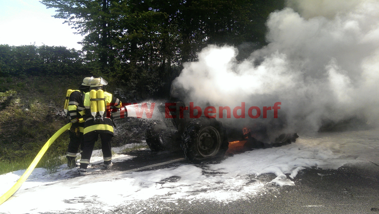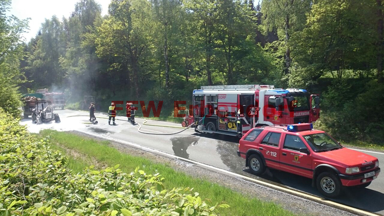 Eine Vollsperrung der B22 zwischen Erbendorf und Waldeck war aufgrund eines Brandes einen landwirtschaftlichen Fahrzeuges am vergangenen Samstag, den 16. Mai 2015, nötig. Unter schwerem Atemschutz löschten Einsatzkräfte der Feuerwehr Erbendorf den Brand, konnten den Totalschaden am Fahrzeug und Schäden am Straßenbelag aber nicht verhindern.