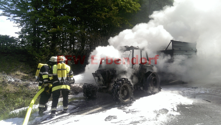 Bei Eintreffen der Freiwilligen Feuerwehr Erbendorf stand die landwirtschaftliche Zugmaschine bereits im Vollbrand. Den Einsatzkräften gelang es unter schwerem Atemschutz in kurzer Zeit den Brand mit Hilfe von Schaum zu löschen. Die Ladung auf dem Kipper, Brennholz, blieb dank des Eingreifens der Feuerwehr unversehrt, lediglich das Zugfahrzeug wurde vollkommen zerstört. Verletzt wurde bei diesem Brand niemand.