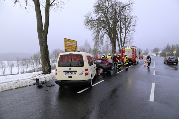Ein Taxifahrer war mit seinem PKW aus Richtung Erbendorf kommend in Richtung Pressath unterwegs. Von der Überleitung von der B22 näherte sich ein weiterer Verkehrsteilnehmer in seinem schwarzen BMW. Als der Fahrer des BMW nach Erbendorf abbiegen wollte, übersah er wahrscheinlich das von dort kommende Taxi und fuhr auf die Straße ein. Infolgedessen kam es zu einem Zusammenstoß der beiden Fahrzeuge. Kurz vor dem Hinweisschild mit den Ortsentfernungsangaben kamen die Fahrzeuge zum Stehen. Beide Fahrer wurden leicht verletzt.