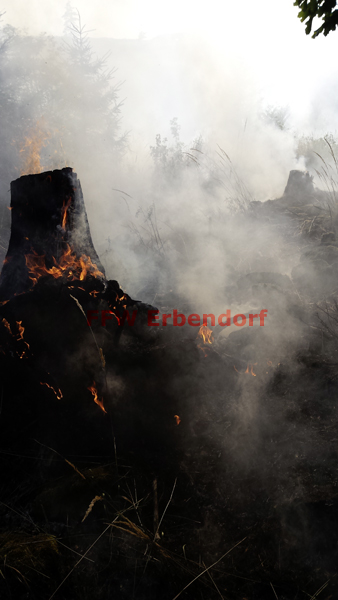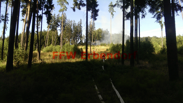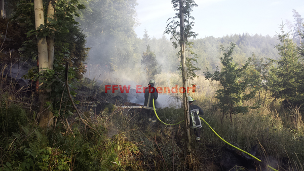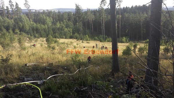 Die FFW Erbendorf begann vom Hilfeleistungslöschgruppenfahrzeug (HLF) aus gleich mit dem Legen einer Schlauchleitung in Richtung Brandherd. Zehn B-Längen (200 m) wurden benötigt, bis der Verteiler gesetzt werden konnte. In Anbetracht des Höhenunterschiedes (ca. 40 m) und des steinigen, unwegsamen Geländes, war dies bei sommerlichen Temperaturen eine erste große Hürde. Gespeist wurde das HLF von Wasser aus dem nahegelegenen Grenzbach. Die Pumpe des HLF bewältigte diese große Herausforderung und konnte drei Angriffstrupps mit C-Rohr speisen. Die drei Angriffstrupps selbst benötigten etwa 15 C-Längen Schlaumaterial, welches ebenso erst den steinigen Hang hinauf gebracht werden musste.