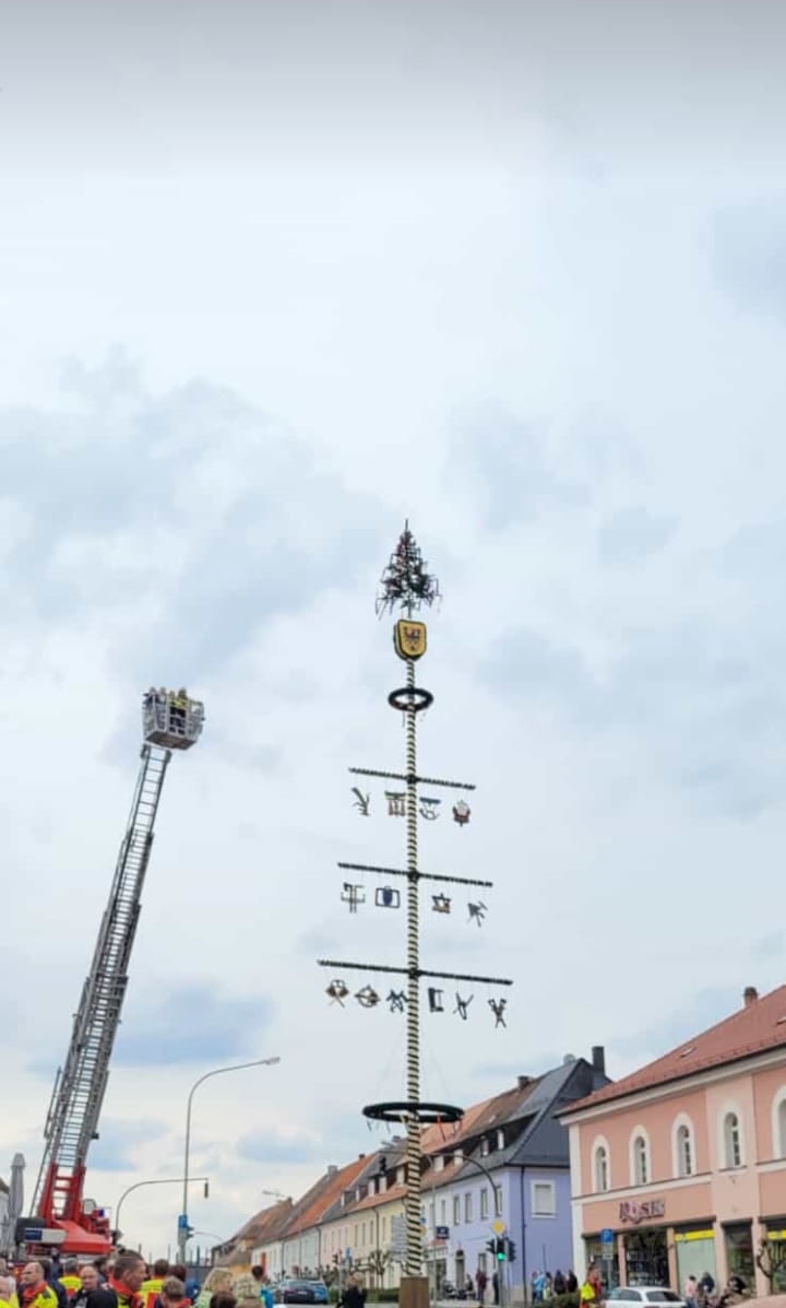 Beinahe Volksfeststimmung herrschte bei der Maibaumaufstellung mit vielen Zuschauern. Nach gut zwei Jahren Corona war es immerhin wieder das erste große Fest in Erbendorf. Bereits am Samstagvormittag bauten die Mitarbeiter des städtischen Bauhofs den Maibaum am Unteren Markt auf. Dabei wurde auch ein nagelneuer Baumstamm verwendet. Denn aus Sicherheitsgründen wurde der alte, gut vier Jahre alte Stamm nicht mehr wiederverwendet. Heuer hat er eine Höhe von knapp 23 Metern.