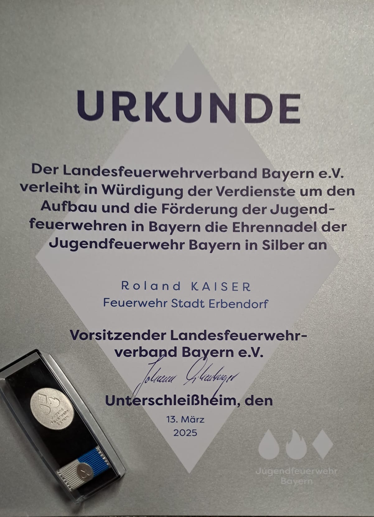 Kemnath. α Die Ehrennadel der Jugendfeuerwehr Bayern des Landesfeuerwehrverbandes wurde unserem ehemaligen Jugendwart Roland Kaiser überreicht. Damit wurde seine Arbeit insbesondere für die Jugendfeuerwehr Erbendorf gewürdigt.