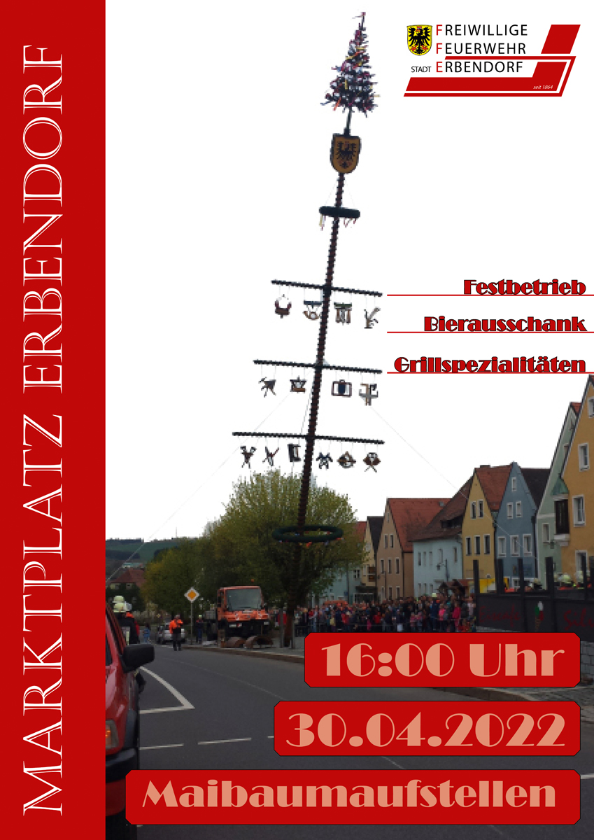 Erbendorf. α Am kommenden Samstag, 30. April 2022, geht es ab 16 Uhr rund am Unteren Markt. Die FFW Erbendorf lädt ein zum Maibaumaufstellen. Mit dabei: leckeres vom Grill, gutes Bier und weitere Getränke sowie der Spielmannszug der FFW Erbendorf.