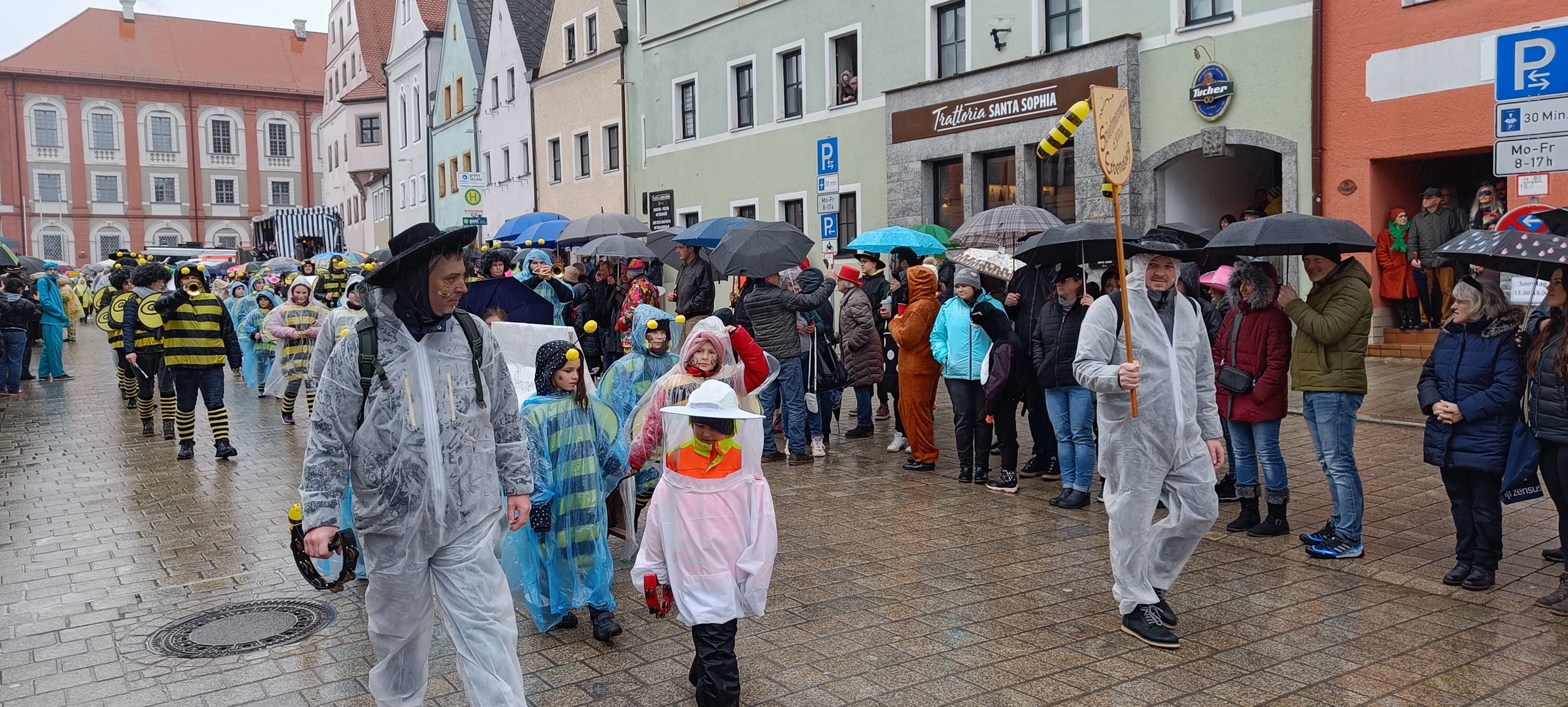 Sicherlich gibt es besseres Wetter als naßkalten Dauerregen für die Spielleute. Doch mit Ponchos einigermaßen vor Regen geschützt, ging es als Bienen verkleidet durch die benachbarte Kreisstadt. Und trotz des schlechten Wetters säumten tausende Zuschauer:innen die Straßen, um dem bunten Treiben beizuwohnen. Der Neue Tag berichtet von 15.000 bis 20.000. Dieses besondere Erlebnis ist immer ein Highlight im Jahresprogramm des Spielmannszuges und tröstet ruchaus über die Nässe und Kälte hinweg. ω