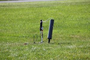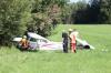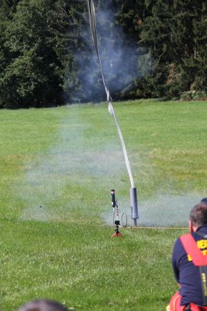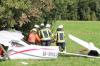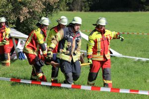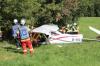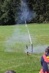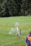 Im Anschluss an den Vortrag, ging es zur Praxis: zunächst zündete Rachl kontrolliert eine Rakete, um den Einsatzkräften die immense Schubkraft zu demonstrieren. Hernach galt es in einer Einsatzübung zwei Verletzte aus einem abgestürzten Fluggerät mit der Kennung D-Mxxx zu retten. Unter der fachmännischen Aufsicht des Flugunfallexperten wurden die beiden Verletzten von Feuerwehr und Rettungsdienst befreit. Natrülich wurde auch die Gefahrenzone in Schussrichtung der Rakete gesichert und die angenomme Unfallstelle entsprechend gesichert. Hie und da gab es noch ein paar Tipps, wie noch effektiver gearbeitet werden könne, aber prinzipiell wurde das Vorgehen der Einsatzkräfte gelobt.