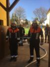 Sofort begaben sich zwei Trupps ins Gebäudeinnere, um die vermisste Person zu suchen. Nach etwa fünf Minuten ertönte ein Funkspruch: "Eine Person gefunden, 1. Obergeschoss im Nebengebäude." Mit einer Krankentrage wurde die vermisste Erziehrin ins Freie gebracht. Im Ernstfall würde sie dem #Rettungsdienst zur Erstversorgung übergeben.