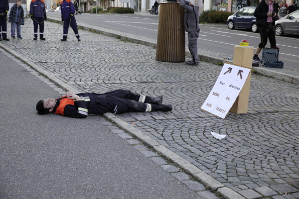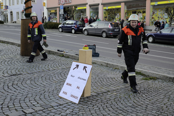 Erbendorf. α "Drücke, wenn du dich traust." Nach dem Maibaumaufstellen auf dem Unteren Markt standen diese Worte auf einem Plakat und dahinter ein großer Knopf. Es dauerte nicht lange, bis jemand diesen drückte. Was dann ablief, überraschte die Besucher. Ein Feuerwehrmann lief heran und blieb bewusstlos liegen, dann kamen mit #Blaulicht die #Einsatzkräfte der Organisierten Ersten Hilfe (#OEH), die mit der #Reanimation begannen.